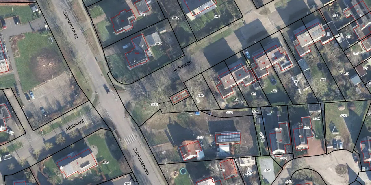 Het adres is gelegen op perceel 1622 in de sectie M en de kadastrale gemeente Vorden. De kadastrale aanduiding is aldus VDN02-M-1622. De gemiddelde perceelgrootte in Vorden is 8281,14 m². Dit perceel is kleiner: de perceeloppervlakte bedraagt 55 m². Het grootste perceel in de kadastrale gemeente is 70,5 ha. Het kleinste perceel heeft een oppervlakte van 0 m². Er zijn geen andere adressen aanwezig op het perceel. De laatste wijziging in het de Basisregistratie Kadaster (BRK) was op 03-04-2012.