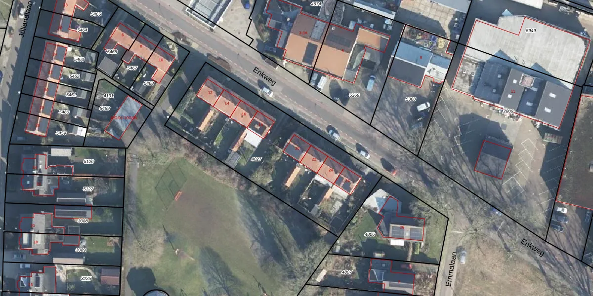 Het perceel waarop Enkweg 20 staat heeft een oppervlakte van 1802 m². Dit is een zeer groot perceel. De perceeloppervlakte wordt geregistreerd door het Kadaster. Gedetailleerde informatie over de maten van dit perceel kunt u vinden in het rapport Kadastrale kaart met maatvoering van Enkweg 20.