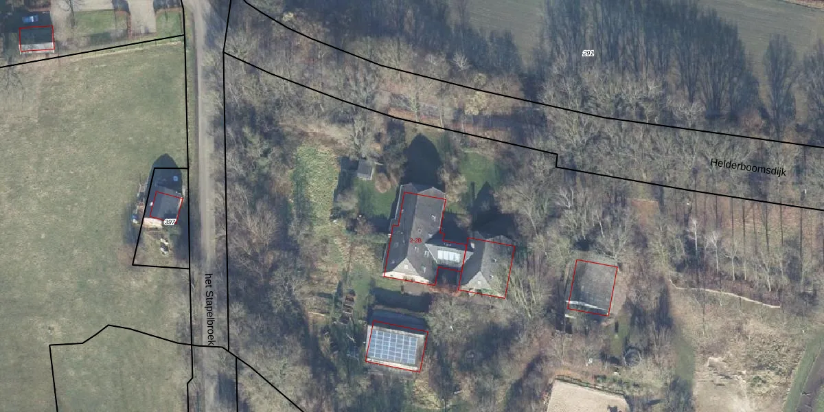 Het perceel waarop Helderboomsdijk 2-A staat heeft een oppervlakte van 2,5 ha. Dit is een zeer groot perceel. De perceeloppervlakte wordt geregistreerd door het Kadaster. Gedetailleerde informatie over de maten van dit perceel kunt u vinden in het rapport Kadastrale kaart met maatvoering van Helderboomsdijk 2-A.