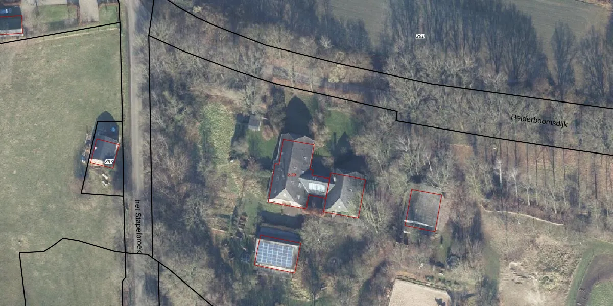 Het perceel waarop Helderboomsdijk 2-B staat heeft een oppervlakte van 2,5 ha. Dit is een zeer groot perceel. De perceeloppervlakte wordt geregistreerd door het Kadaster. Gedetailleerde informatie over de maten van dit perceel kunt u vinden in het rapport Kadastrale kaart met maatvoering van Helderboomsdijk 2-B.