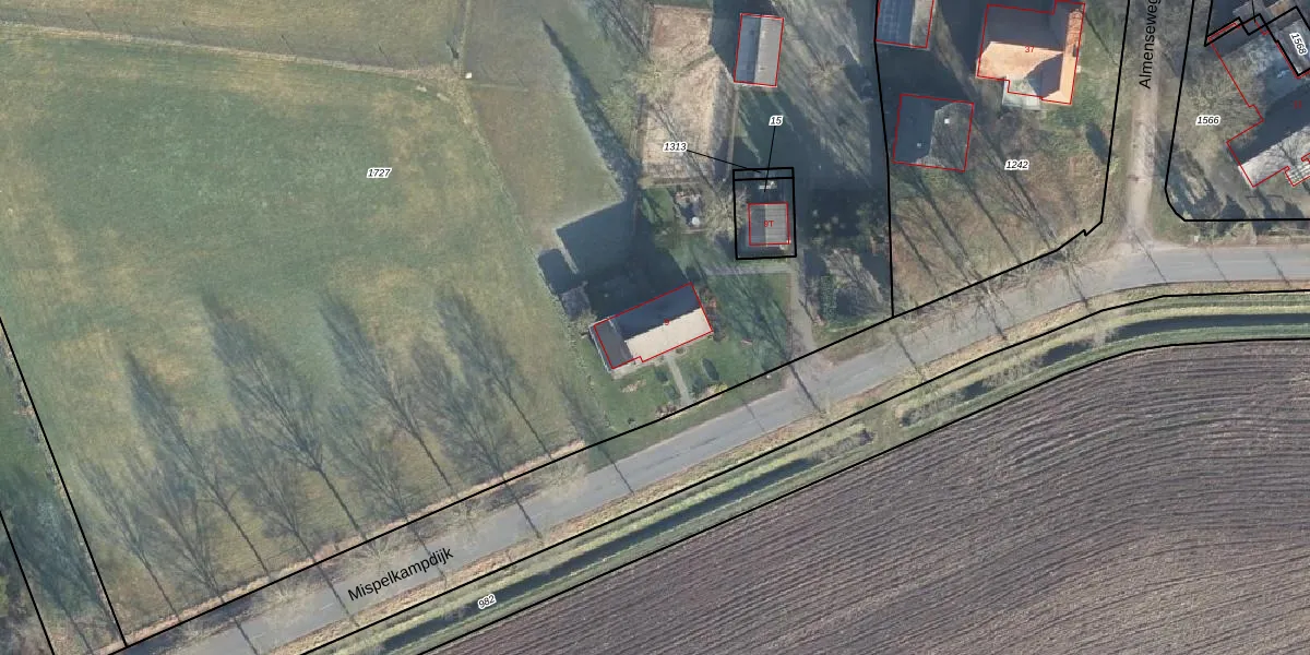 Het perceel waarop Mispelkampdijk 9 staat heeft een oppervlakte van 1,6 ha. Dit is een zeer groot perceel. De perceeloppervlakte wordt geregistreerd door het Kadaster. Gedetailleerde informatie over de maten van dit perceel kunt u vinden in het rapport Kadastrale kaart met maatvoering van Mispelkampdijk 9.