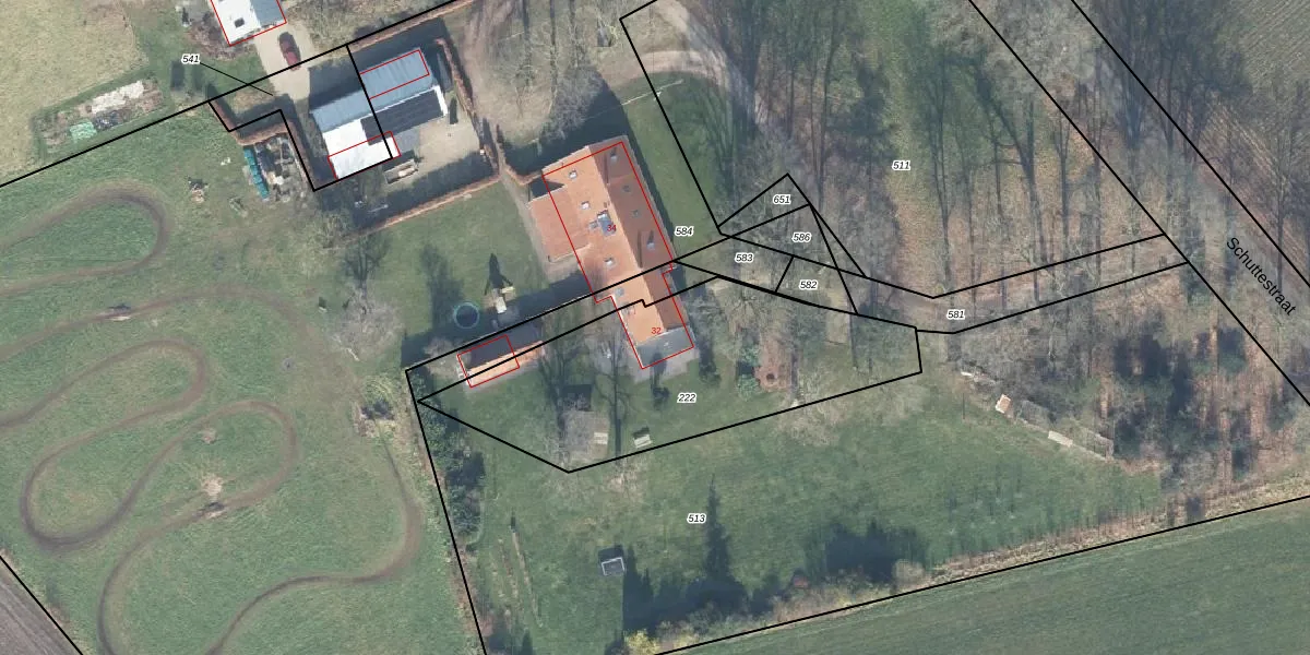 Schuttestraat 32 is gelegen op kadastraal perceel VDN02O222. Deze kadastrale aanduiding is uniek en wordt gebruikt door het Kadaster om eigendomsrechten en andere zakelijke rechten vast te leggen. Het perceel maakt onderdeel uit van de kadastrale gemeente Vorden.