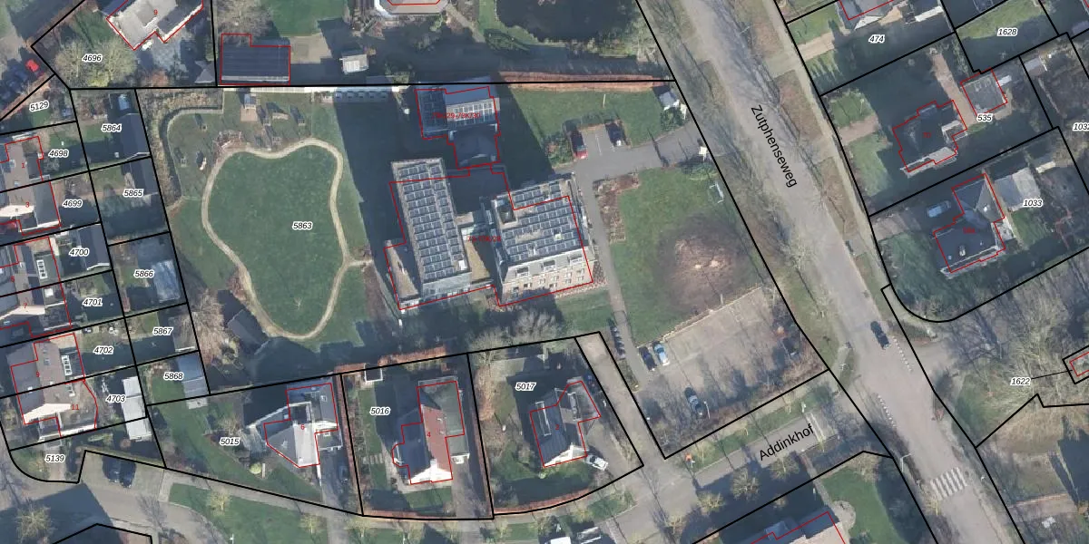 Het adres is gelegen op perceel 5863 in de sectie K en de kadastrale gemeente Vorden. De kadastrale aanduiding is aldus VDN02-K-5863. Het perceel is kleiner dan gemiddeld in Vorden. Het perceel is 5890 m² groot, terwijl het gemiddelde ligt op 8274,07 m². Het grootste perceel in de kadastrale gemeente is 70,5 ha. Het kleinste perceel heeft een oppervlakte van 0 m². Er zijn 31 adressen aanwezig op het perceel. De laatste wijziging in het de Basisregistratie Kadaster (BRK) was op 29-08-2014.