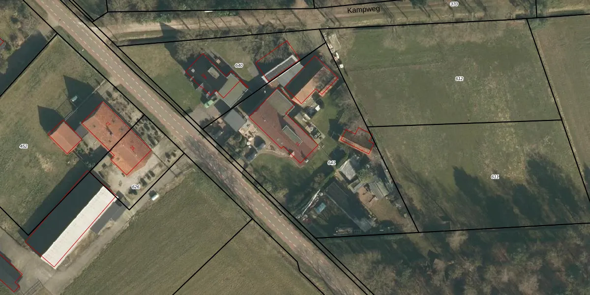 Het perceel waarop Kampweg 16 staat heeft een oppervlakte van 2482 m². Dit is een zeer groot perceel. De perceeloppervlakte wordt geregistreerd door het Kadaster. Gedetailleerde informatie over de maten van dit perceel kunt u vinden in het rapport Kadastrale kaart met maatvoering van Kampweg 16.