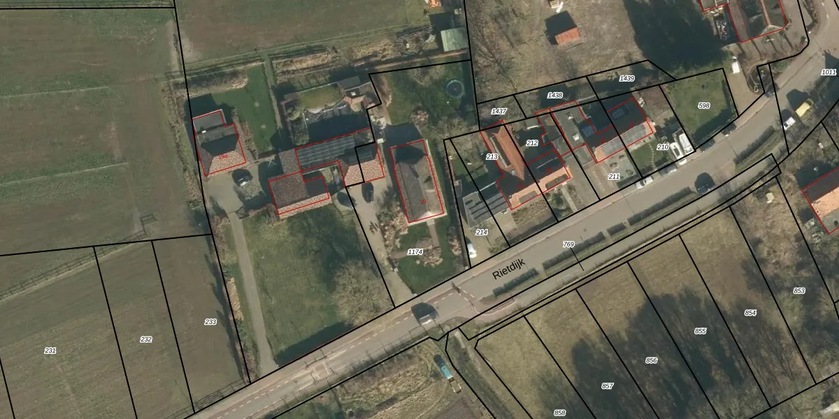 Het perceel waarop Rietdijk 19 staat heeft een oppervlakte van 1225 m². Dit is een zeer groot perceel. De perceeloppervlakte wordt geregistreerd door het Kadaster. Gedetailleerde informatie over de maten van dit perceel kunt u vinden in het rapport Kadastrale kaart met maatvoering van Rietdijk 19.