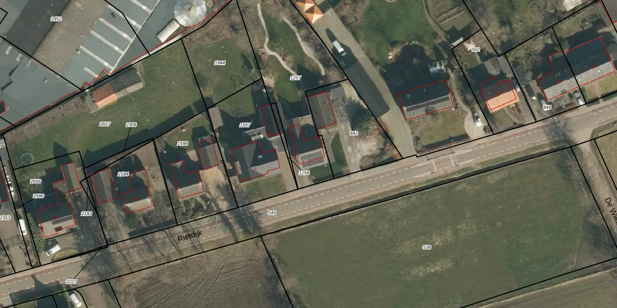 Het perceel waarop Rietdijk 7 staat heeft een oppervlakte van 1108 m². Dit is een zeer groot perceel. De perceeloppervlakte wordt geregistreerd door het Kadaster. Gedetailleerde informatie over de maten van dit perceel kunt u vinden in het rapport Kadastrale kaart met maatvoering van Rietdijk 7.