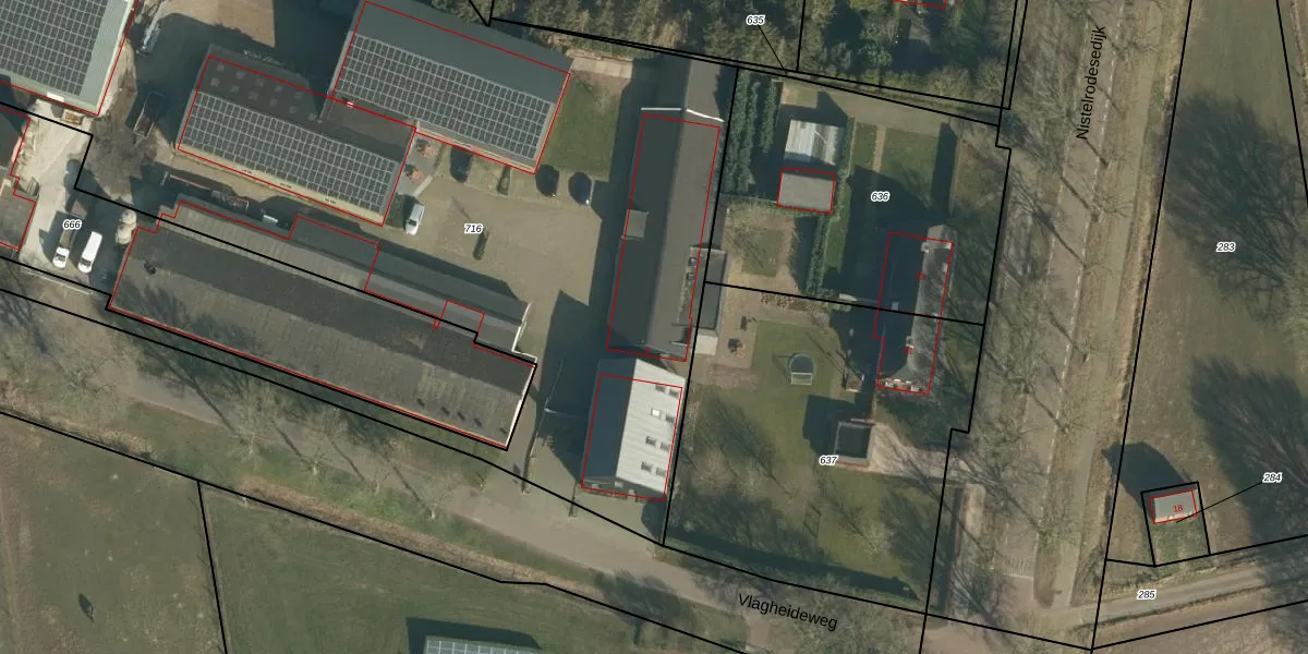 Vlagheideweg 2 is gelegen op kadastraal perceel NTR00K716. Deze kadastrale aanduiding is uniek en wordt gebruikt door het Kadaster om eigendomsrechten en andere zakelijke rechten vast te leggen. Het perceel maakt onderdeel uit van de kadastrale gemeente Nistelrode.
