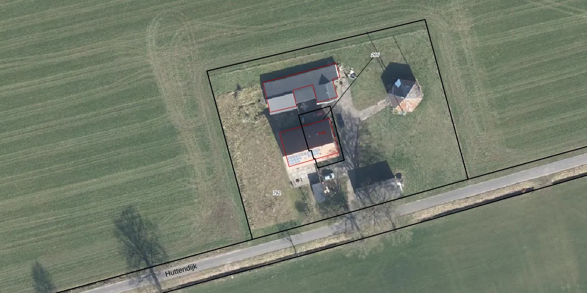 Het perceel waarop Huttendijk 6-a staat heeft een oppervlakte van 4230 m². Dit is een zeer groot perceel. De perceeloppervlakte wordt geregistreerd door het Kadaster. Gedetailleerde informatie over de maten van dit perceel kunt u vinden in het rapport Kadastrale kaart met maatvoering van Huttendijk 6-a.