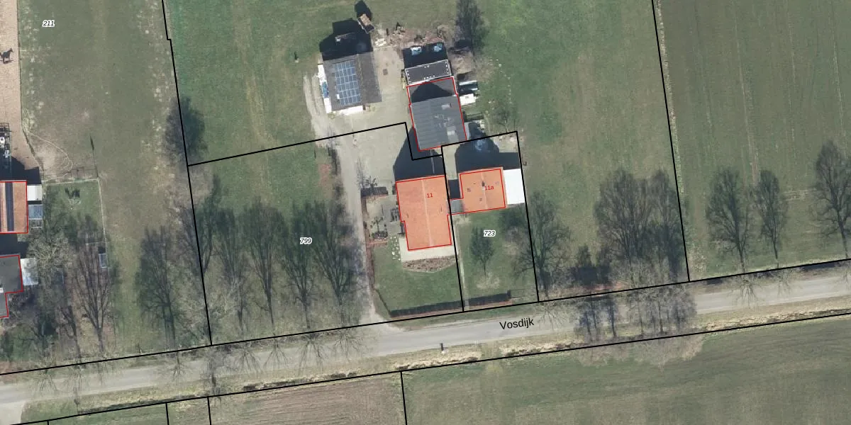 Het perceel waarop Vosdijk 11 staat heeft een oppervlakte van 2595 m². Dit is een zeer groot perceel. De perceeloppervlakte wordt geregistreerd door het Kadaster. Gedetailleerde informatie over de maten van dit perceel kunt u vinden in het rapport Kadastrale kaart met maatvoering van Vosdijk 11.