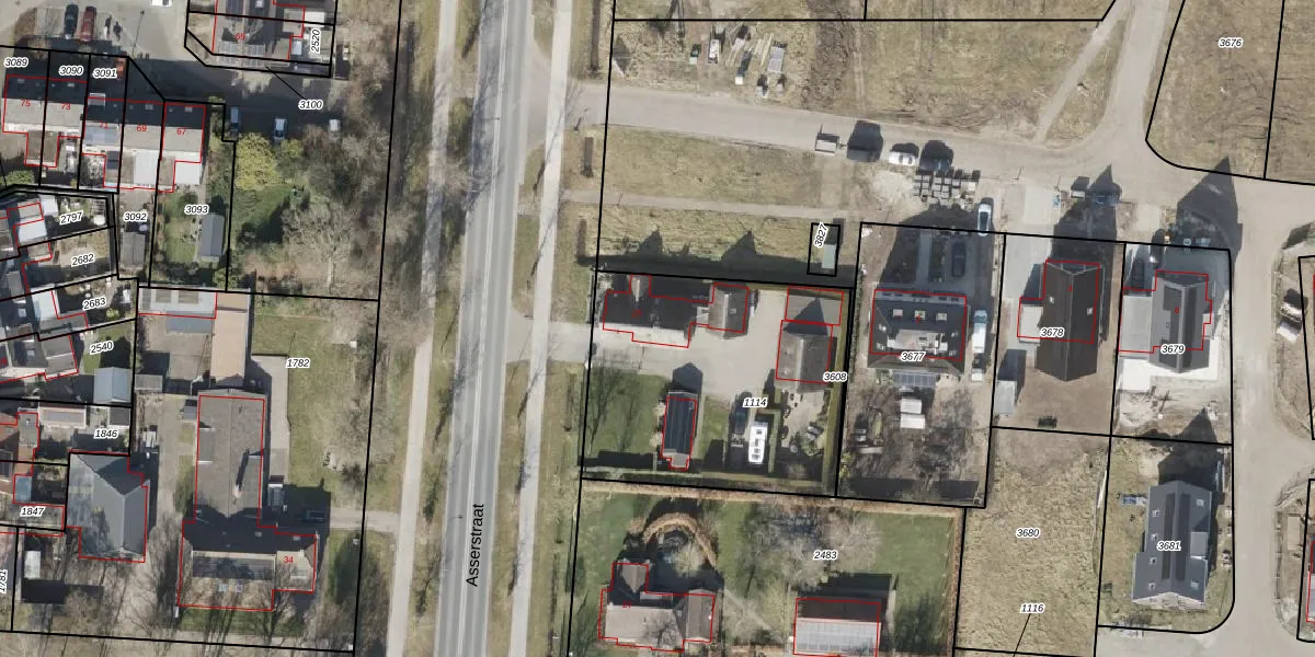 Het perceel waarop Asserstraat 25 staat heeft een oppervlakte van 1260 m². Dit is een zeer groot perceel. De perceeloppervlakte wordt geregistreerd door het Kadaster. Gedetailleerde informatie over de maten van dit perceel kunt u vinden in het rapport Kadastrale kaart met maatvoering van Asserstraat 25.