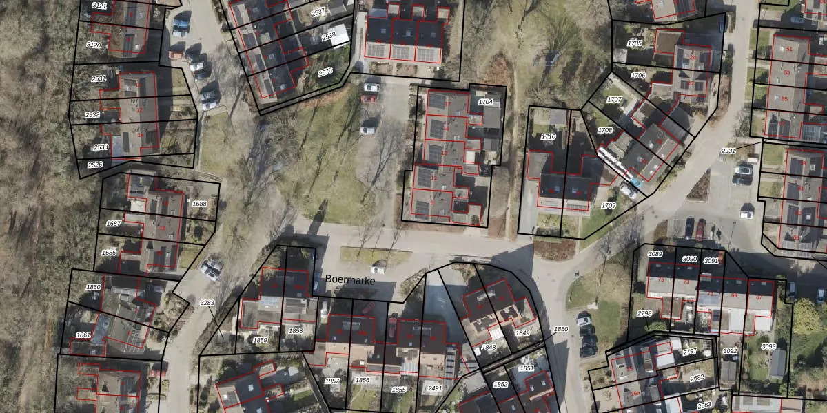Het perceel waarop Boermarke 9 staat heeft een oppervlakte van 699 m². Dit is een groot perceel. De perceeloppervlakte wordt geregistreerd door het Kadaster. Gedetailleerde informatie over de maten van dit perceel kunt u vinden in het rapport Kadastrale kaart met maatvoering van Boermarke 9.