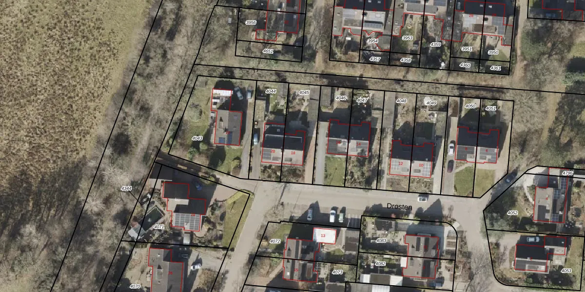 Drosten 18 is gelegen op kadastraal perceel VRI00P4045. Deze kadastrale aanduiding is uniek en wordt gebruikt door het Kadaster om eigendomsrechten en andere zakelijke rechten vast te leggen. Het perceel maakt onderdeel uit van de kadastrale gemeente Vries.