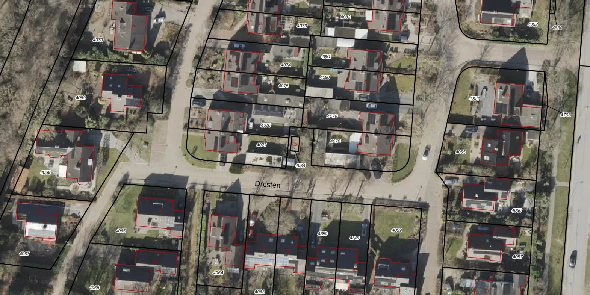 Het perceel waarop Drosten 25 staat heeft een oppervlakte van 15 m². Dit is een klein perceel. De perceeloppervlakte wordt geregistreerd door het Kadaster. Gedetailleerde informatie over de maten van dit perceel kunt u vinden in het rapport Kadastrale kaart met maatvoering van Drosten 25.