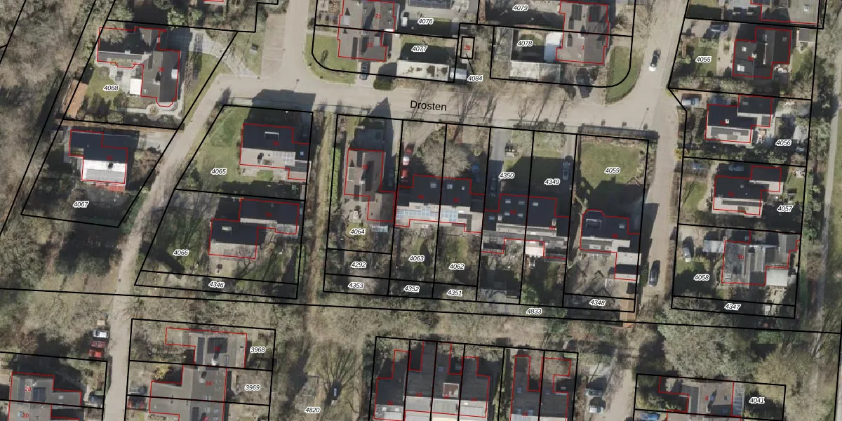 Het perceel waarop Drosten 40 staat heeft een oppervlakte van 399 m². Dit is een groot perceel. De perceeloppervlakte wordt geregistreerd door het Kadaster. Gedetailleerde informatie over de maten van dit perceel kunt u vinden in het rapport Kadastrale kaart met maatvoering van Drosten 40.