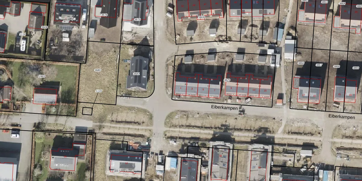 Eiberkampen 1 is gelegen op kadastraal perceel VRI00T3829. Deze kadastrale aanduiding is uniek en wordt gebruikt door het Kadaster om eigendomsrechten en andere zakelijke rechten vast te leggen. Het perceel maakt onderdeel uit van de kadastrale gemeente Vries.