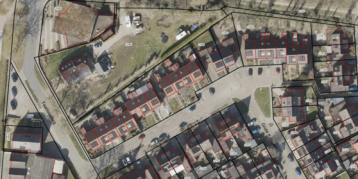 Het perceel waarop Grote Kampen 19 staat heeft een oppervlakte van 2057 m². Dit is een zeer groot perceel. De perceeloppervlakte wordt geregistreerd door het Kadaster. Gedetailleerde informatie over de maten van dit perceel kunt u vinden in het rapport Kadastrale kaart met maatvoering van Grote Kampen 19.