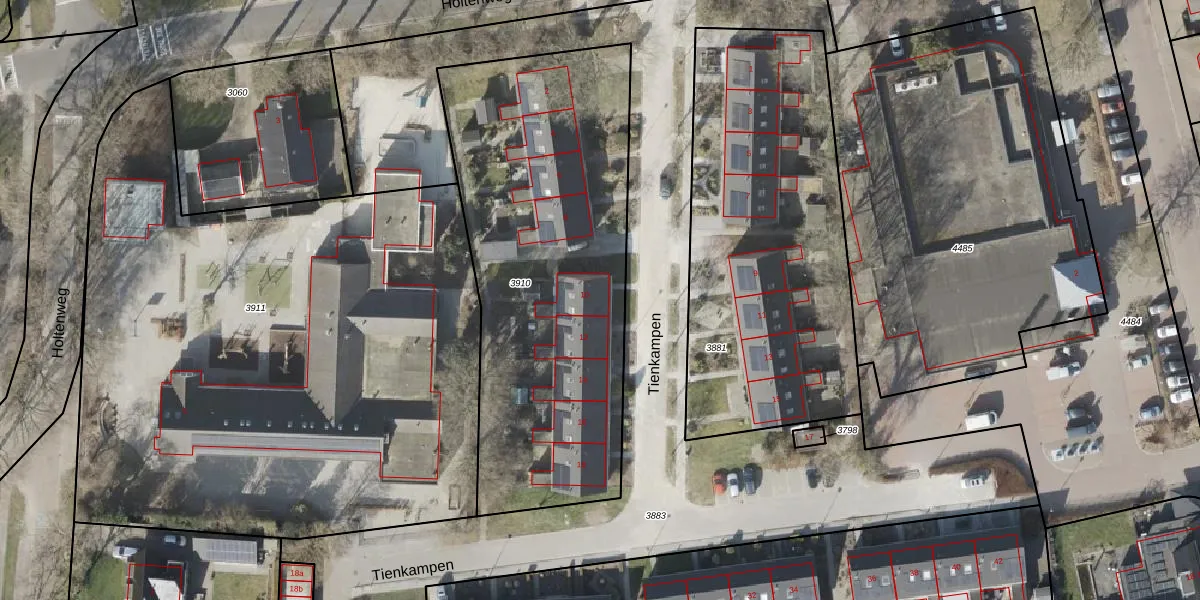 Tienkampen 10 is gelegen op kadastraal perceel VRI00P3910. Deze kadastrale aanduiding is uniek en wordt gebruikt door het Kadaster om eigendomsrechten en andere zakelijke rechten vast te leggen. Het perceel maakt onderdeel uit van de kadastrale gemeente Vries.