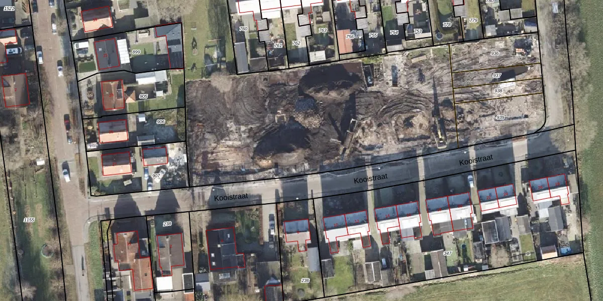 Het perceel waarop Kooistraat 5 staat heeft een oppervlakte van 8625 m². Dit is een zeer groot perceel. De perceeloppervlakte wordt geregistreerd door het Kadaster. Gedetailleerde informatie over de maten van dit perceel kunt u vinden in het rapport Kadastrale kaart met maatvoering van Kooistraat 5.