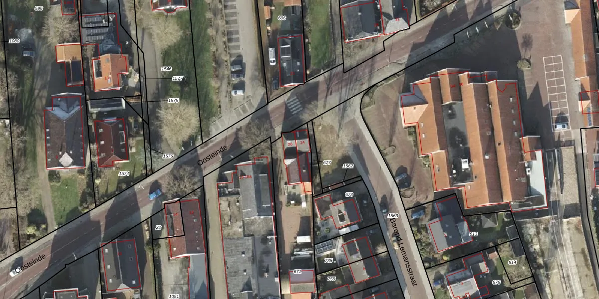 Het perceel waarop Oosteinde 24 staat heeft een oppervlakte van 1258 m². Dit is een zeer groot perceel. De perceeloppervlakte wordt geregistreerd door het Kadaster. Gedetailleerde informatie over de maten van dit perceel kunt u vinden in het rapport Kadastrale kaart met maatvoering van Oosteinde 24.