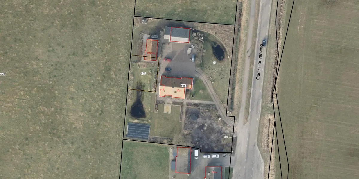 Oude Hoevenweg 103 is gelegen op kadastraal perceel VZV00I876. Deze kadastrale aanduiding is uniek en wordt gebruikt door het Kadaster om eigendomsrechten en andere zakelijke rechten vast te leggen. Het perceel maakt onderdeel uit van de kadastrale gemeente Vriezenveen.