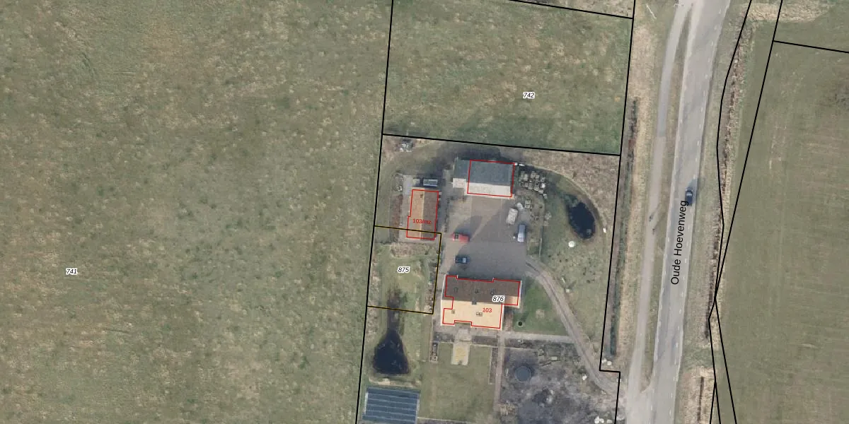 Oude Hoevenweg 103-mz is gelegen op kadastraal perceel VZV00I876. Deze kadastrale aanduiding is uniek en wordt gebruikt door het Kadaster om eigendomsrechten en andere zakelijke rechten vast te leggen. Het perceel maakt onderdeel uit van de kadastrale gemeente Vriezenveen.
