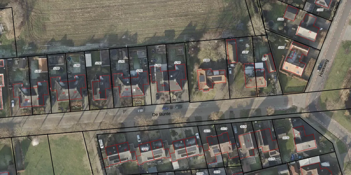 Het perceel waarop De Bunte 12 staat heeft een oppervlakte van 369 m². Dit is een groot perceel. De perceeloppervlakte wordt geregistreerd door het Kadaster. Gedetailleerde informatie over de maten van dit perceel kunt u vinden in het rapport Kadastrale kaart met maatvoering van De Bunte 12.