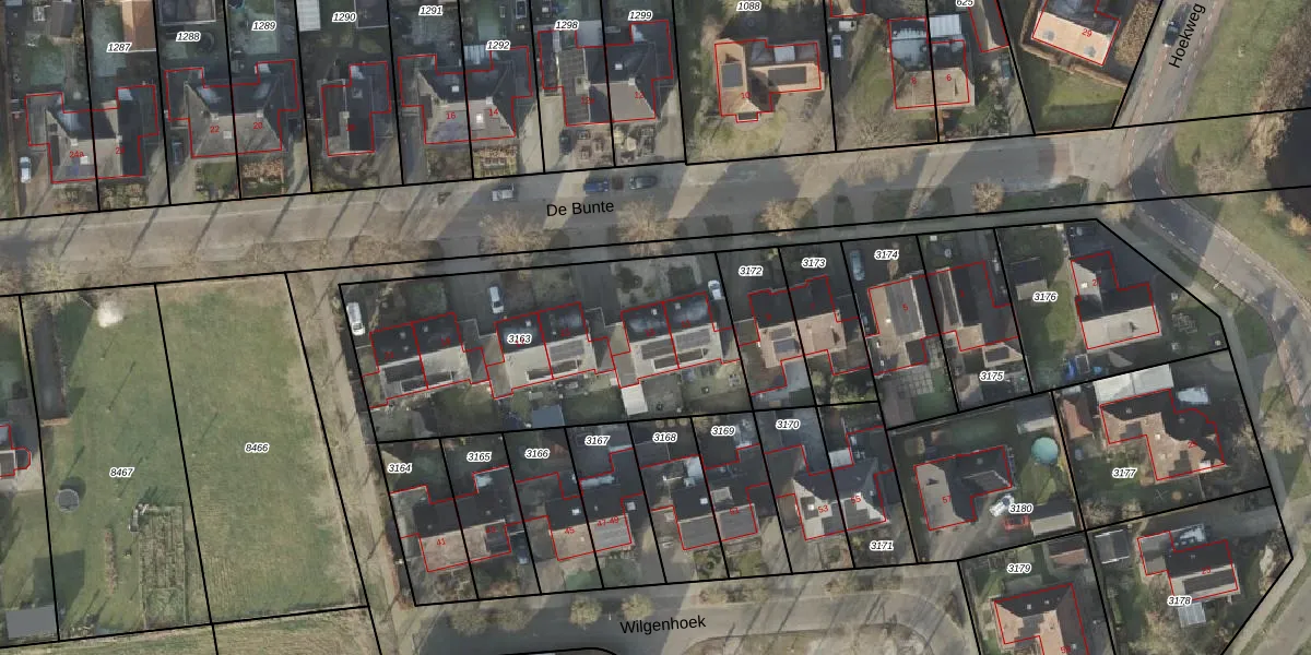 Het perceel waarop De Bunte 13 staat heeft een oppervlakte van 1421 m². Dit is een zeer groot perceel. De perceeloppervlakte wordt geregistreerd door het Kadaster. Gedetailleerde informatie over de maten van dit perceel kunt u vinden in het rapport Kadastrale kaart met maatvoering van De Bunte 13.
