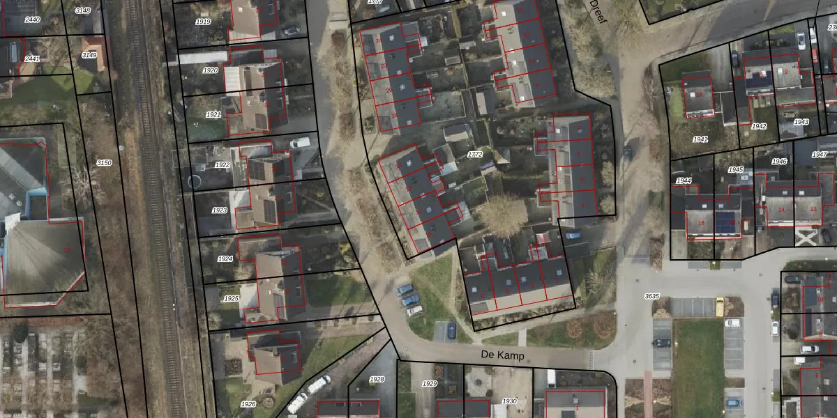 Het perceel waarop De Kamp 12 staat heeft een oppervlakte van 3585 m². Dit is een zeer groot perceel. De perceeloppervlakte wordt geregistreerd door het Kadaster. Gedetailleerde informatie over de maten van dit perceel kunt u vinden in het rapport Kadastrale kaart met maatvoering van De Kamp 12.