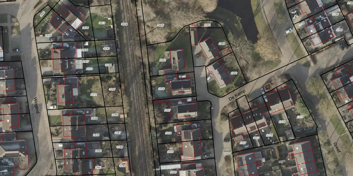 Het perceel waarop De Kamp 31 staat heeft een oppervlakte van 343 m². Dit is een groot perceel. De perceeloppervlakte wordt geregistreerd door het Kadaster. Gedetailleerde informatie over de maten van dit perceel kunt u vinden in het rapport Kadastrale kaart met maatvoering van De Kamp 31.