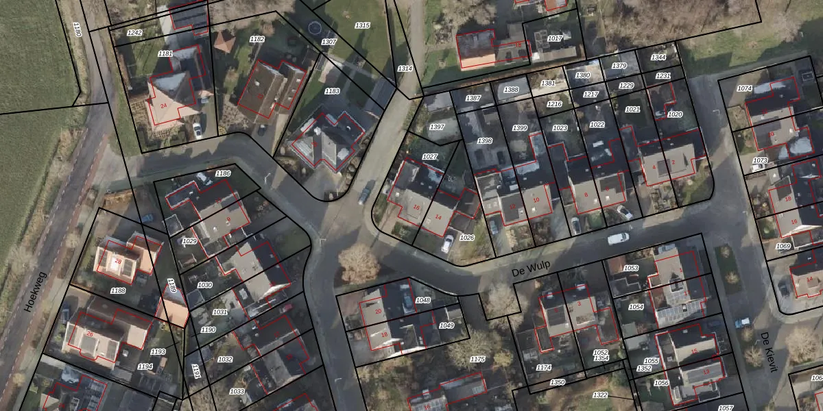 Het perceel waarop De Wulp 16 staat heeft een oppervlakte van 313 m². Dit is een groot perceel. De perceeloppervlakte wordt geregistreerd door het Kadaster. Gedetailleerde informatie over de maten van dit perceel kunt u vinden in het rapport Kadastrale kaart met maatvoering van De Wulp 16.