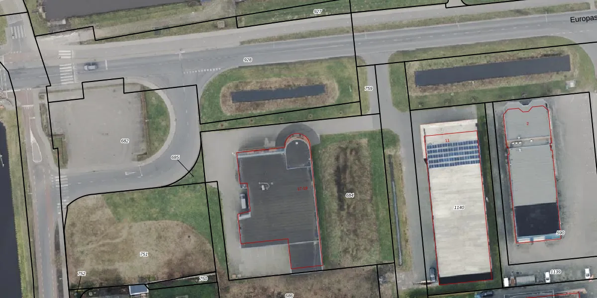 Het perceel waarop Europasingel 17 staat heeft een oppervlakte van 2905 m². Dit is een zeer groot perceel. De perceeloppervlakte wordt geregistreerd door het Kadaster. Gedetailleerde informatie over de maten van dit perceel kunt u vinden in het rapport Kadastrale kaart met maatvoering van Europasingel 17.