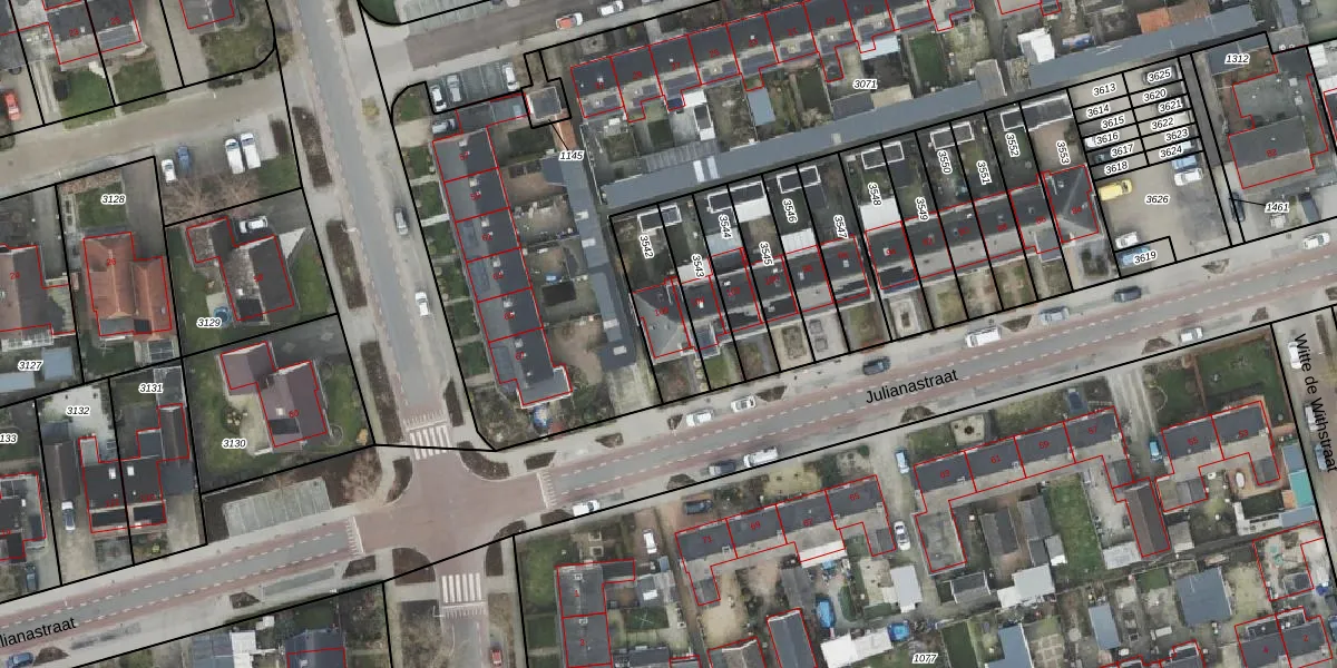 Julianastraat 106 is gelegen op kadastraal perceel HAM00G3542. Deze kadastrale aanduiding is uniek en wordt gebruikt door het Kadaster om eigendomsrechten en andere zakelijke rechten vast te leggen. Het perceel maakt onderdeel uit van de kadastrale gemeente Den Ham.