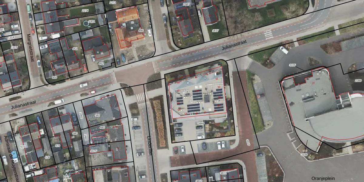 Oranjeplein 32 is gelegen op kadastraal perceel HAM00G3949. Deze kadastrale aanduiding is uniek en wordt gebruikt door het Kadaster om eigendomsrechten en andere zakelijke rechten vast te leggen. Het perceel maakt onderdeel uit van de kadastrale gemeente Den Ham.