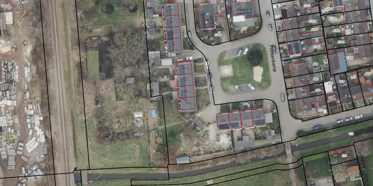 Het perceel waarop Prinsenkamp 104 staat heeft een oppervlakte van 1,1 ha. Dit is een zeer groot perceel. De perceeloppervlakte wordt geregistreerd door het Kadaster. Gedetailleerde informatie over de maten van dit perceel kunt u vinden in het rapport Kadastrale kaart met maatvoering van Prinsenkamp 104.