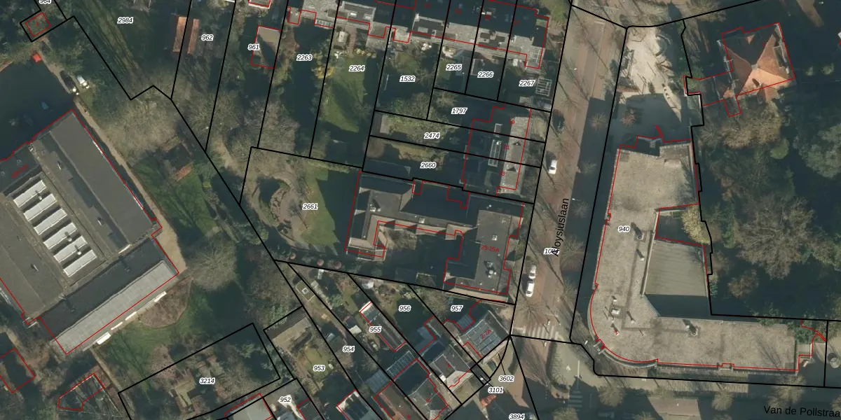 Het perceel waarop Aloysiuslaan 25-A staat heeft een oppervlakte van 1663 m². Dit is een zeer groot perceel. De perceeloppervlakte wordt geregistreerd door het Kadaster. Gedetailleerde informatie over de maten van dit perceel kunt u vinden in het rapport Kadastrale kaart met maatvoering van Aloysiuslaan 25-A.