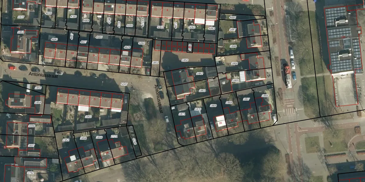 Het perceel waarop Antoniusstraat 2 staat heeft een oppervlakte van 296 m². Dit is een middelgroot perceel. De perceeloppervlakte wordt geregistreerd door het Kadaster. Gedetailleerde informatie over de maten van dit perceel kunt u vinden in het rapport Kadastrale kaart met maatvoering van Antoniusstraat 2.