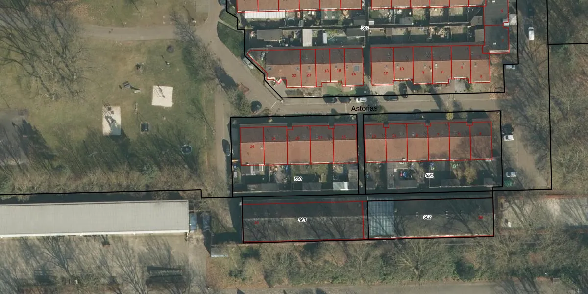 Astorias 19 is gelegen op kadastraal perceel VUG00A590. Deze kadastrale aanduiding is uniek en wordt gebruikt door het Kadaster om eigendomsrechten en andere zakelijke rechten vast te leggen. Het perceel maakt onderdeel uit van de kadastrale gemeente Vught.