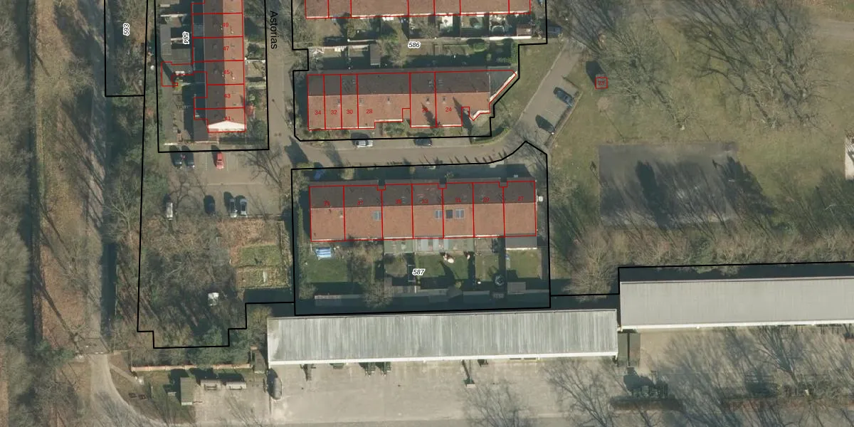 Het perceel waarop Astorias 33 staat heeft een oppervlakte van 2079 m². Dit is een zeer groot perceel. De perceeloppervlakte wordt geregistreerd door het Kadaster. Gedetailleerde informatie over de maten van dit perceel kunt u vinden in het rapport Kadastrale kaart met maatvoering van Astorias 33.
