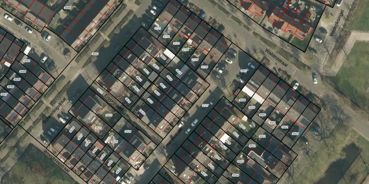 Gebruik de zoekbalk of klik op een perceel voor informatie over de adressen binnen dit perceel.