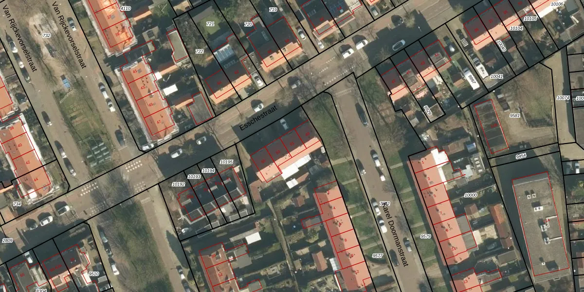Het perceel waarop Esschestraat 51 staat heeft een oppervlakte van 4390 m². Dit is een zeer groot perceel. De perceeloppervlakte wordt geregistreerd door het Kadaster. Gedetailleerde informatie over de maten van dit perceel kunt u vinden in het rapport Kadastrale kaart met maatvoering van Esschestraat 51.