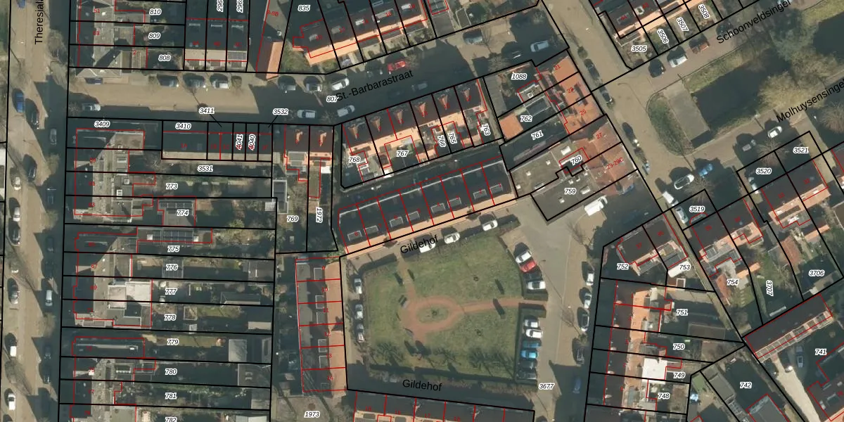 Het perceel waarop Gildehof 5 staat heeft een oppervlakte van 2069 m². Dit is een zeer groot perceel. De perceeloppervlakte wordt geregistreerd door het Kadaster. Gedetailleerde informatie over de maten van dit perceel kunt u vinden in het rapport Kadastrale kaart met maatvoering van Gildehof 5.
