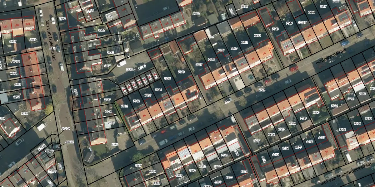 Hadewychstraat 38 is gelegen op kadastraal perceel VUG00B7636. Deze kadastrale aanduiding is uniek en wordt gebruikt door het Kadaster om eigendomsrechten en andere zakelijke rechten vast te leggen. Het perceel maakt onderdeel uit van de kadastrale gemeente Vught.