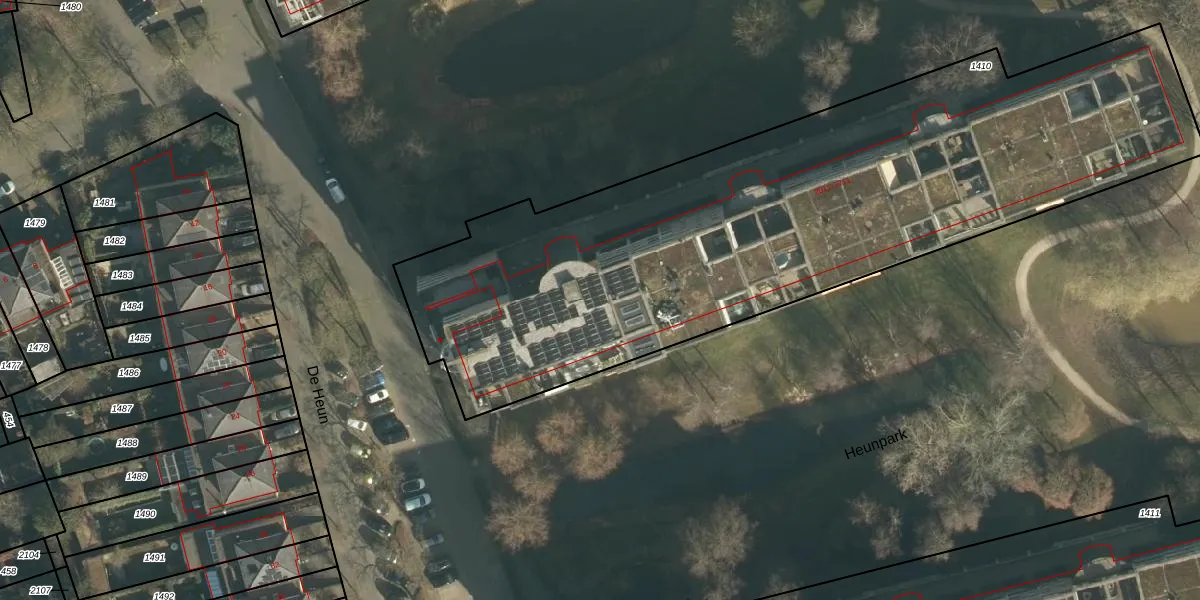 Het perceel waarop Heunpark 2033 staat heeft een oppervlakte van 3654 m². Dit is een zeer groot perceel. De perceeloppervlakte wordt geregistreerd door het Kadaster. Gedetailleerde informatie over de maten van dit perceel kunt u vinden in het rapport Kadastrale kaart met maatvoering van Heunpark 2033.