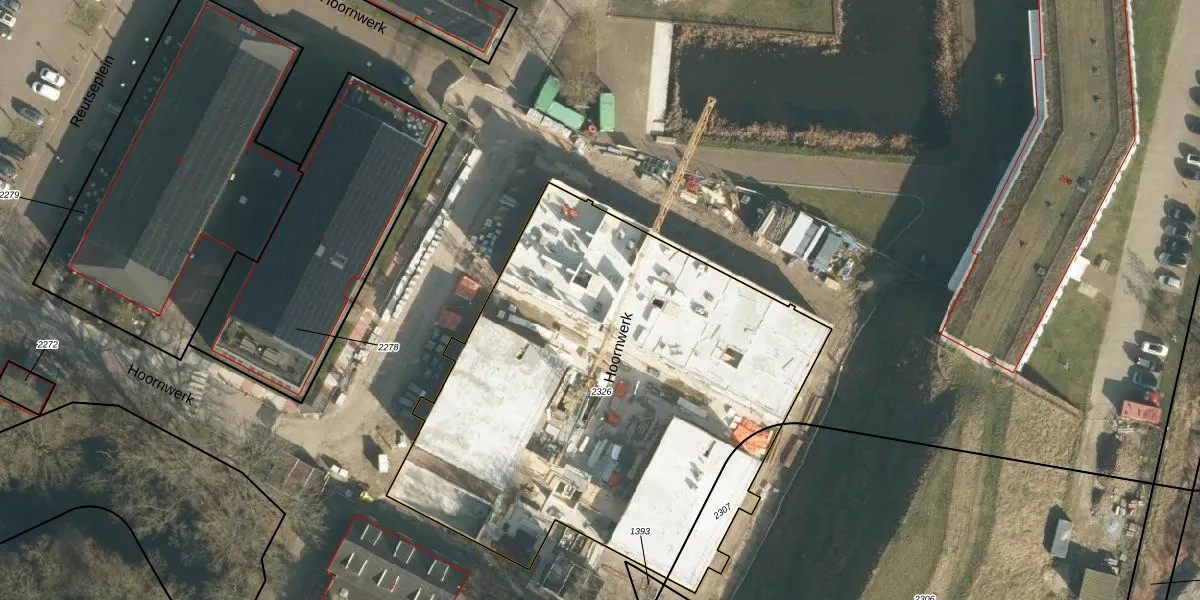 Het perceel waarop Hoornwerk 90 staat heeft een oppervlakte van 2746 m². Dit is een zeer groot perceel. De perceeloppervlakte wordt geregistreerd door het Kadaster. Gedetailleerde informatie over de maten van dit perceel kunt u vinden in het rapport Kadastrale kaart met maatvoering van Hoornwerk 90.