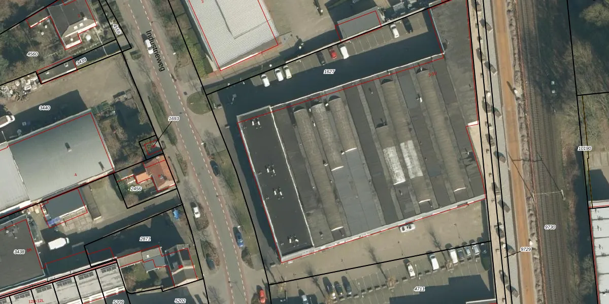 Het perceel waarop Industrieweg 3-A staat heeft een oppervlakte van 5953 m². Dit is een zeer groot perceel. De perceeloppervlakte wordt geregistreerd door het Kadaster. Gedetailleerde informatie over de maten van dit perceel kunt u vinden in het rapport Kadastrale kaart met maatvoering van Industrieweg 3-A.