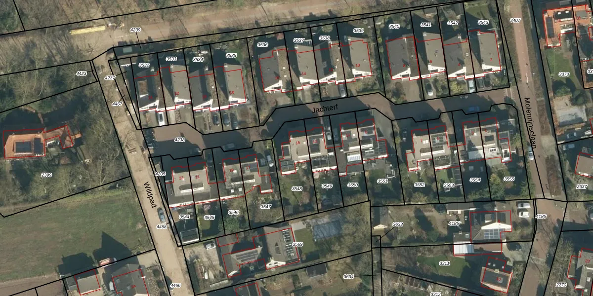 Het perceel waarop Jachterf 15 staat heeft een oppervlakte van 370 m². Dit is een groot perceel. De perceeloppervlakte wordt geregistreerd door het Kadaster. Gedetailleerde informatie over de maten van dit perceel kunt u vinden in het rapport Kadastrale kaart met maatvoering van Jachterf 15.