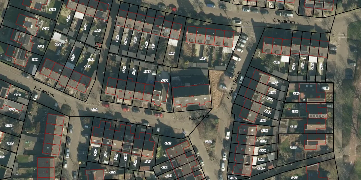 Het perceel waarop Kalverdam 24 staat heeft een oppervlakte van 1275 m². Dit is een zeer groot perceel. De perceeloppervlakte wordt geregistreerd door het Kadaster. Gedetailleerde informatie over de maten van dit perceel kunt u vinden in het rapport Kadastrale kaart met maatvoering van Kalverdam 24.