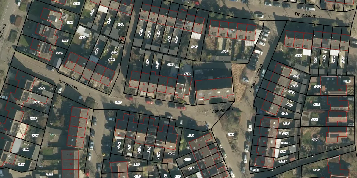 Het perceel waarop Kalverdam 26 staat heeft een oppervlakte van 250 m². Dit is een middelgroot perceel. De perceeloppervlakte wordt geregistreerd door het Kadaster. Gedetailleerde informatie over de maten van dit perceel kunt u vinden in het rapport Kadastrale kaart met maatvoering van Kalverdam 26.