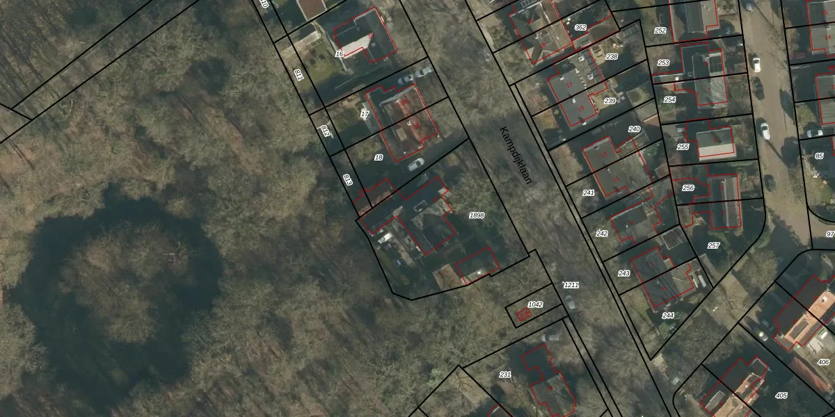 Kampdijklaan 14 is gelegen op kadastraal perceel VUG00K1898. Deze kadastrale aanduiding is uniek en wordt gebruikt door het Kadaster om eigendomsrechten en andere zakelijke rechten vast te leggen. Het perceel maakt onderdeel uit van de kadastrale gemeente Vught.