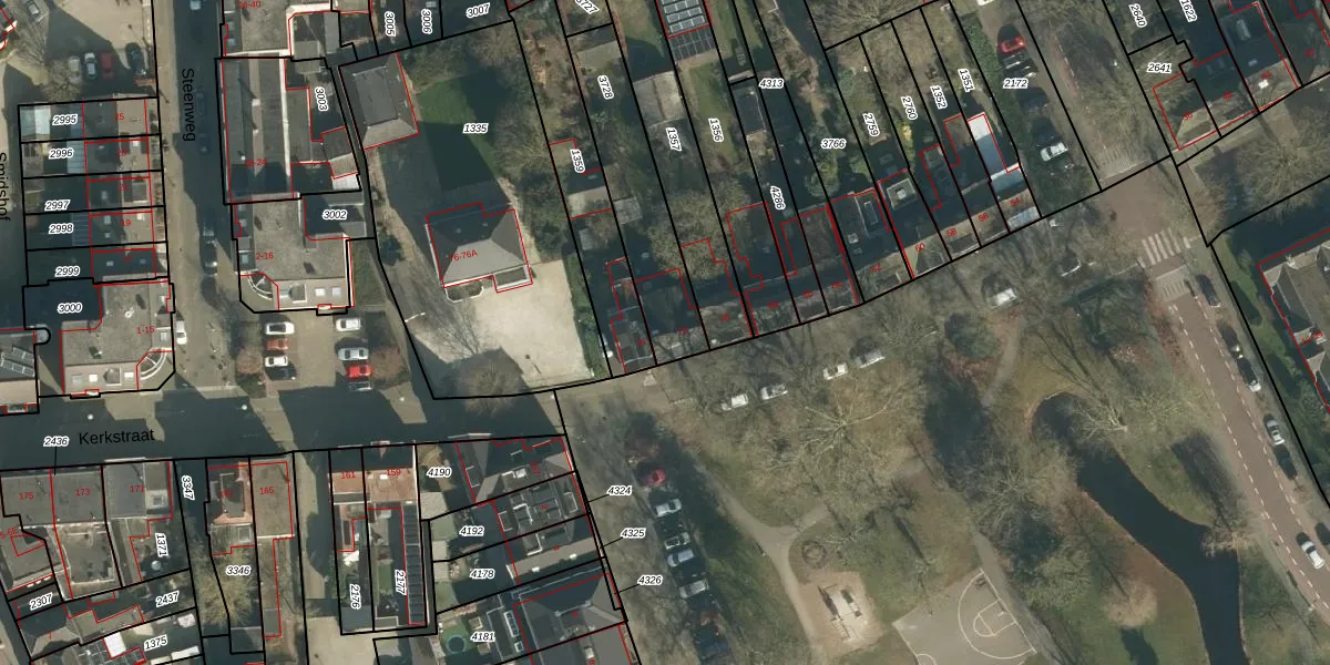 Het perceel waarop Kerkstraat 72 staat heeft een oppervlakte van 408 m². Dit is een groot perceel. De perceeloppervlakte wordt geregistreerd door het Kadaster. Gedetailleerde informatie over de maten van dit perceel kunt u vinden in het rapport Kadastrale kaart met maatvoering van Kerkstraat 72.